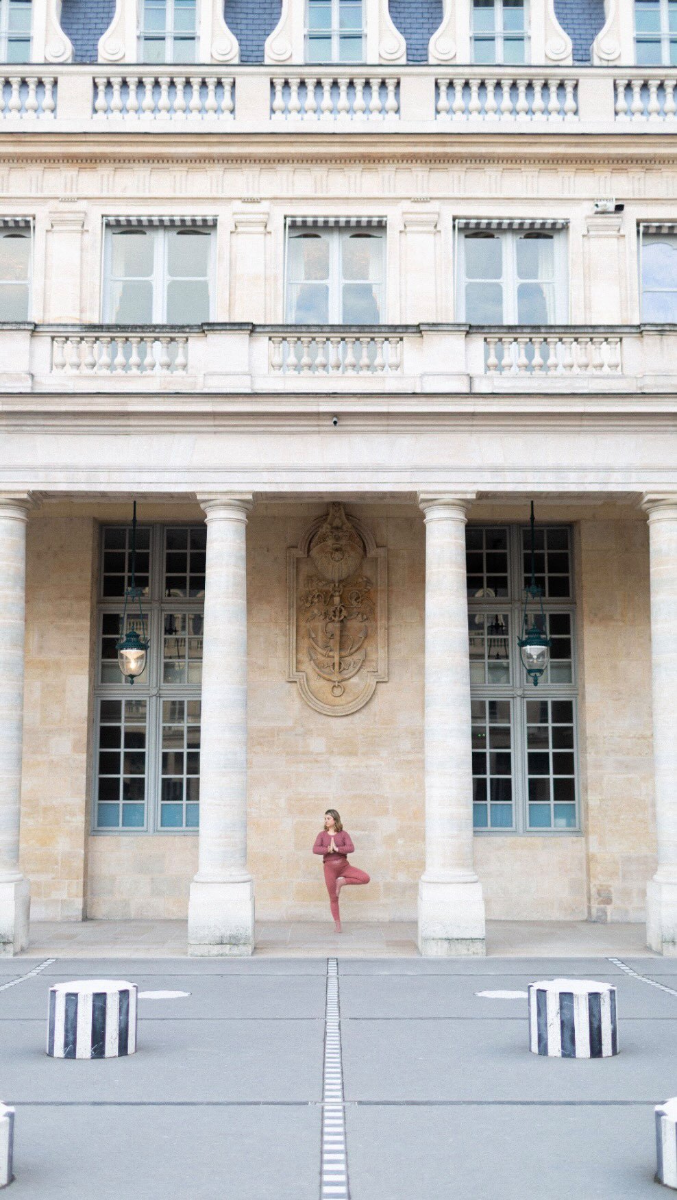 Une femme pratique le yoga devant un bâtiment de style classique, portant une tenue noire et rose, dans un espace en plein air.